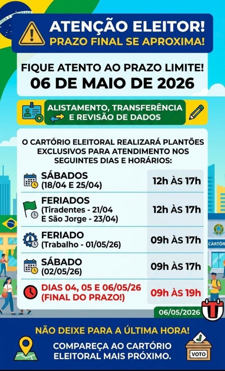 A recomendação é que os eleitores não deixem para a última hora, evitando filas e possíveis imprevistos. O comparecimento deve ser feito ao cartório eleitoral mais próximo, com a documentação necessária.