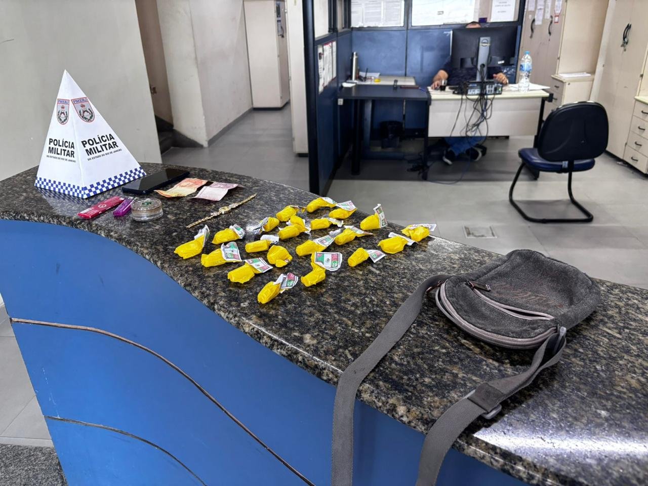 No saco que ele carregava havia 77 tabletes de maconha, 74 pedras de cracks, 16 pinos de cocaína e 22 reais em dinheiro. Todos traziam a inscrição CV nas embalagens, que vem a ser a sigla da organização criminosa Comando Vermelho.